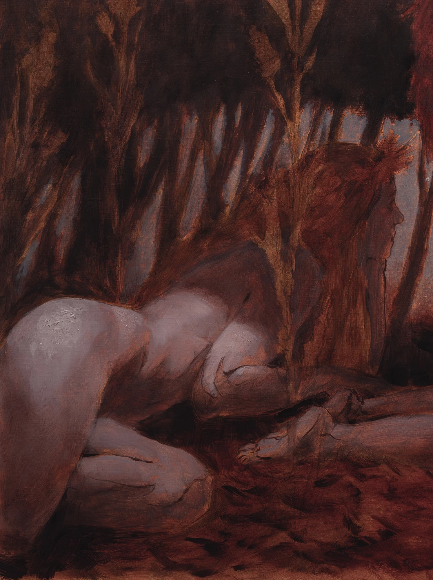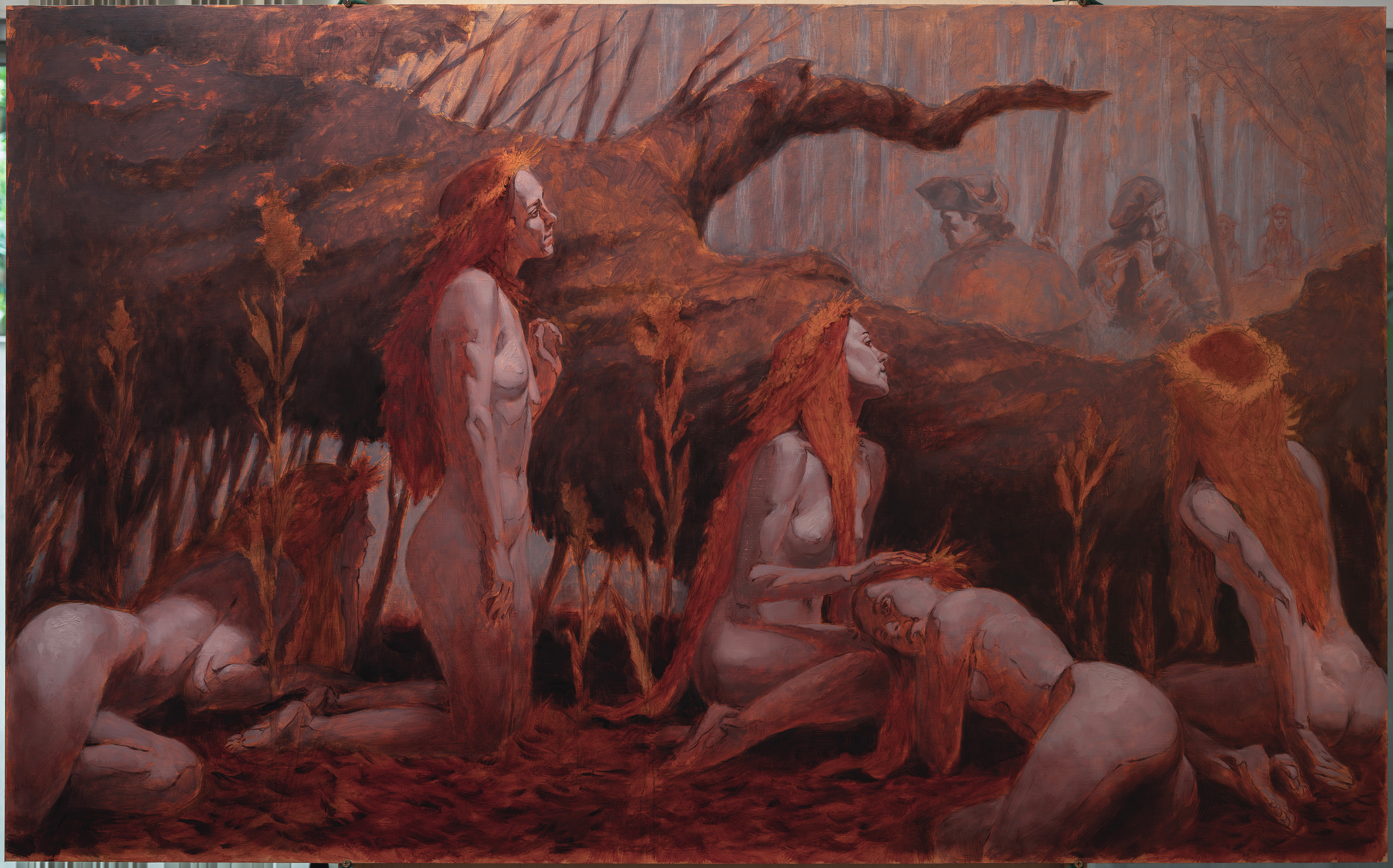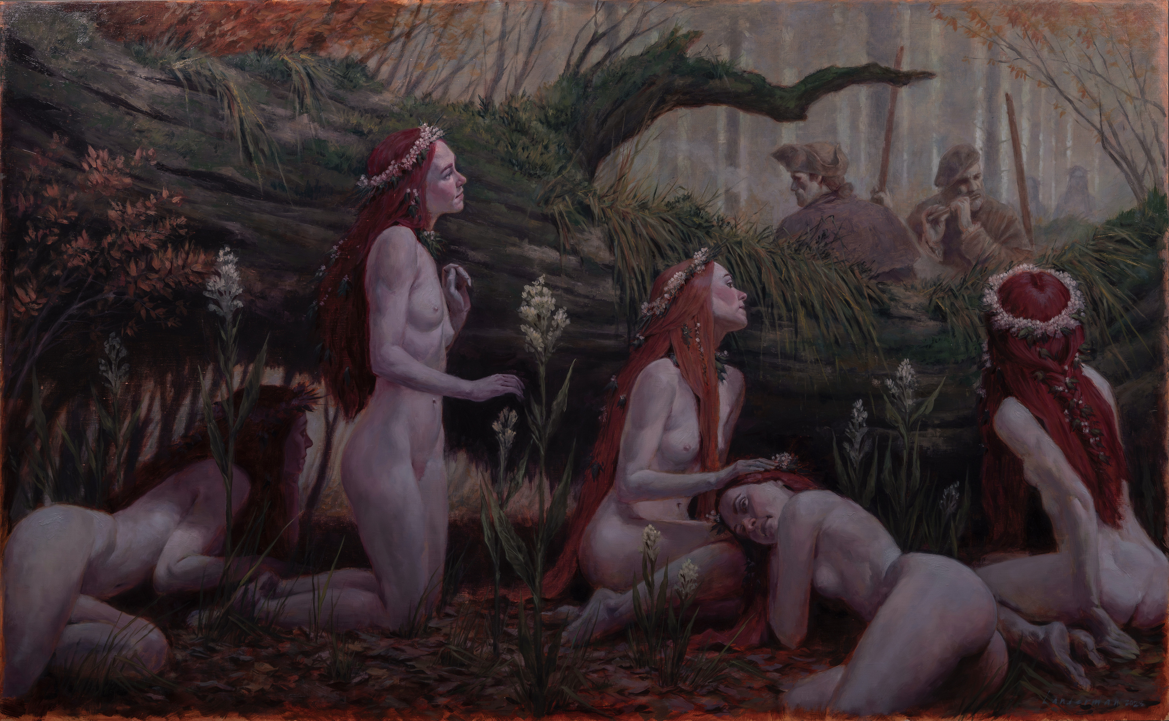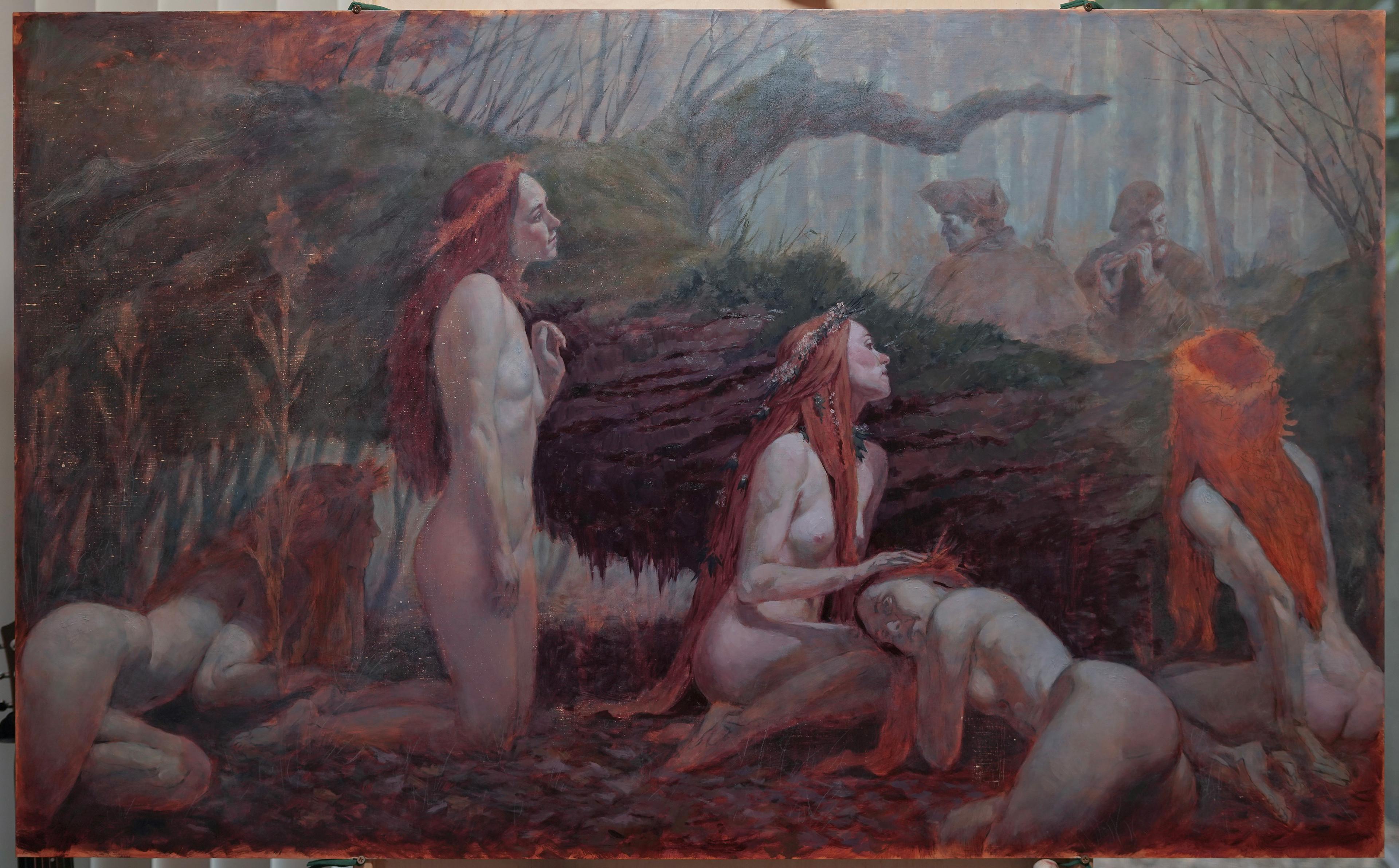 A 33"x55" oil painting I'd finished last year depicting dryad sisters eavesdropping as a man plays his flute. A slight nod to Pan I suppose. Some process pics as well.